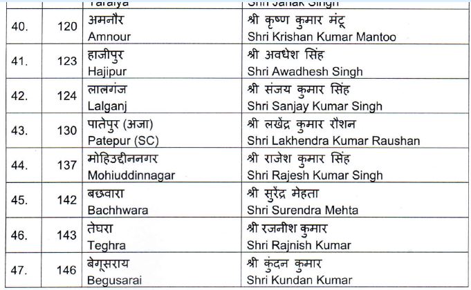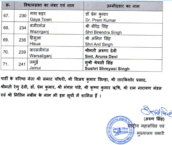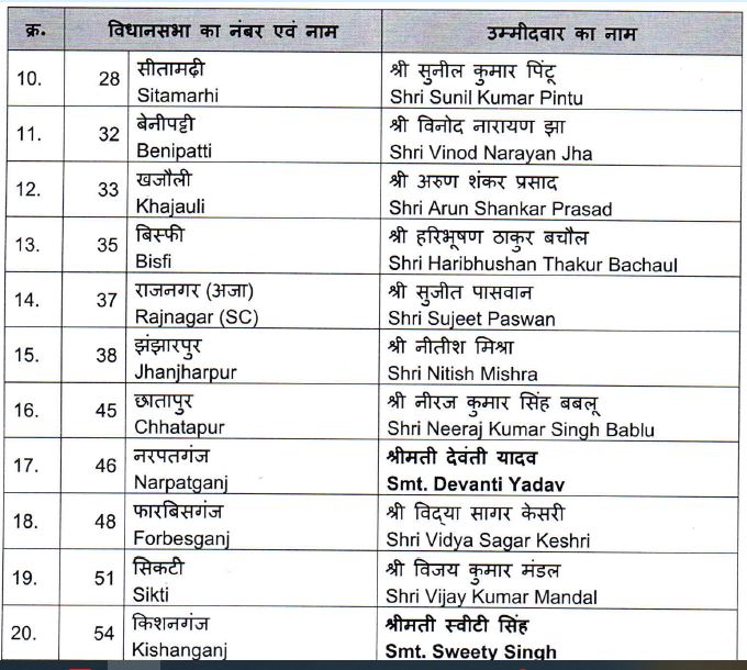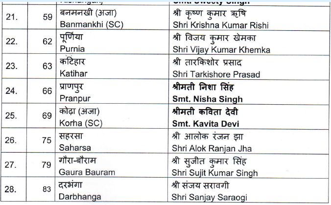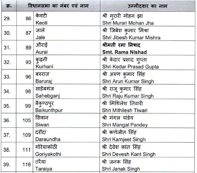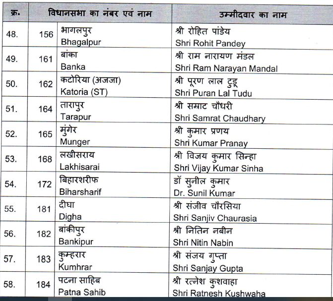 इस सूची में सवर्ण- 35, ओबीसी-11, अनुसूचित जाति/ जनजाति- 6, अत्यंत पिछड़ा वर्ग के 19 उम्मीदवार हैं। दोनों उपमुख्यमंत्री सहित 13 मंत्री इस सूची में शामिल हैं।