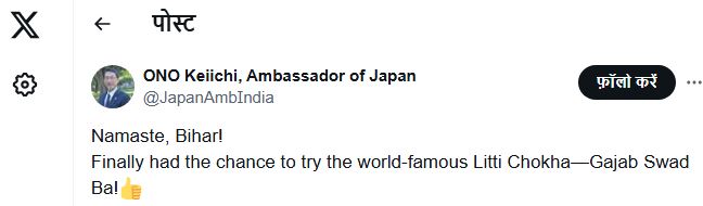 सोशल मीडिया प्लेटफार्म X पर लिट्टी-चोखा के स्वाद का आनंद लेते केइची ओनो की तस्वीर और उसके साथ उनका लिखा- ‘गजब के स्वाद बा (ग्रेट)’ तेजी से वायरल हो रहा है। जापान के राजदूत ओनो गत शुक्रवार को बोध गया गए थे। वहां उन्होंने महाबोधि मंदिर परिसर स्थित विभिन्न स्थानों का भ्रमण किया था और बोधि वृक्ष के नीचे बैठकर ध्यान भी लगाया था। उनके साथ एक पूरा प्रतिनिधिमंडल था जिसमें जापान टूरिज्म एजेंसी के कमिश्नर नाओया हराइकावा और जापान एंबेसी के सेकंड सेक्रेटरी यूरता साइटो के अलावा अन्य अधिकारी भी मौजूद थे.