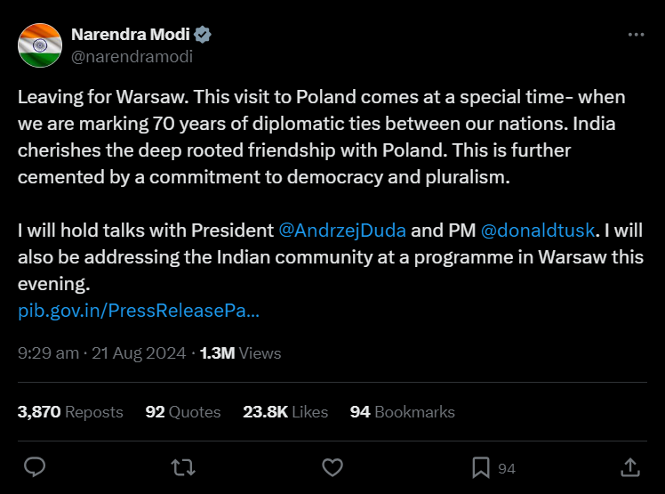 बुधवार (21 अगस्त 2024) को PM Narendra Modi पोलैंड पहुंचे, 4 दशकों में मोदी इस देश का दौरा करने वाले पहले प्रधानमंत्री हैं। पोलैंड का दौरा करने वाले अंतिम भारतीय प्रधानमंत्री मोरारजी देसाई थे। संयोग से यह यात्रा भारत और पोलैंड के बीच राजनयिक संबंधों की स्थापना की 70 वीं anniversary पर हो रही है। Modi ने इसे लेकर अपने twitter account पर एक पोस्ट भी डाला, उन्होनें कहा है :-